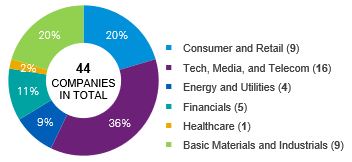 The following chart provides an analysis of these 44 companies and a breakdown of total companies per sector is provided in brackets within the legend.